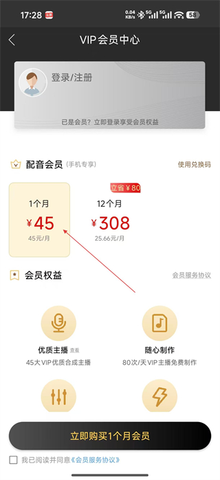 2、在VIP會員中心頁面選擇配音會員套餐比如1個月45元,勾選同意會員服務協議,點擊立即購買1個月會員按鈕,完成會員開通流程。