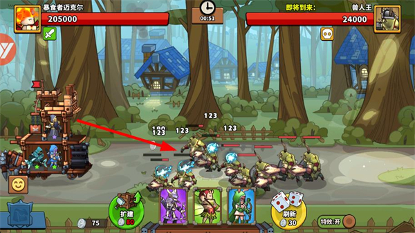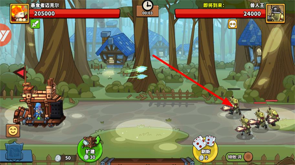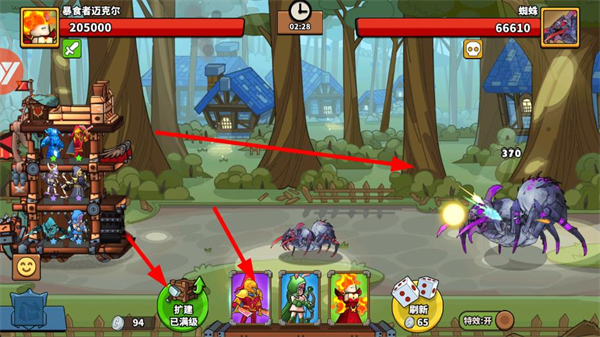 4、點擊擴建按鈕擴建建筑,同時召喚新英雄加入戰斗,以此應對如巨型蜘蛛等強力敵人,順利推進塔防進程。