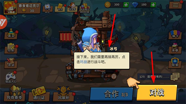 1、點擊對戰按鈕開啟戰斗,冰弓等英雄參與,指揮英雄迎擊魔物,開啟塔防對戰挑戰。