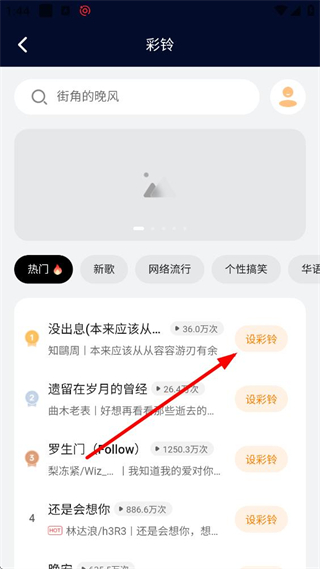 2、進入彩鈴頁面,能瀏覽熱門分類下的各類彩鈴,選擇心儀的彩鈴后點擊其旁的設彩鈴按鈕,進入彩鈴設置界面。