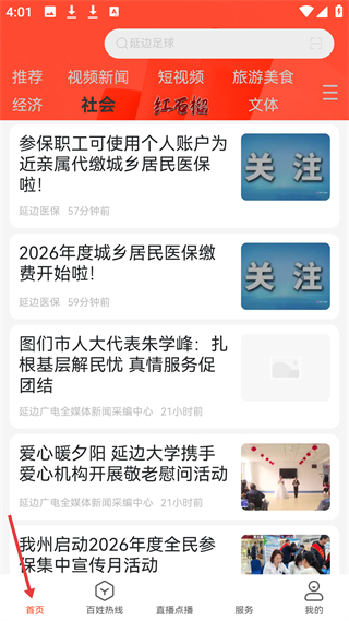 1、首頁,社會欄目發布醫保代繳、繳費、人大代表服務、敬老慰問等資訊,還有全民參保宣傳月活動報道。