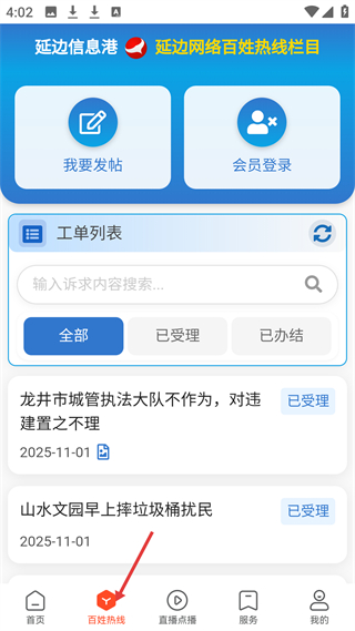1、進入百姓熱線頁面,可使用我要發帖反映訴求,或在工單列表搜索欄輸入內容,篩選全部已受理已辦結工單,查看居民養狗狂吠人行道燈損壞等訴求。