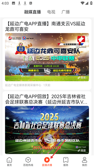 3、直播點播板塊,有融媒直播等分類,發布延邊龍鼎足球賽直播、吉林社會足球聯賽決賽回放等體育賽事內容。