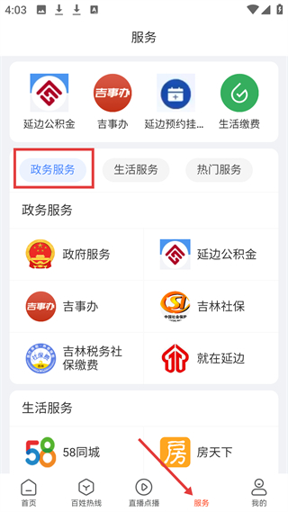 4、服務板塊,涵蓋公積金、吉事辦等服務,政務服務包含政務服務、社保等,生活服務有58同城、房天下等。