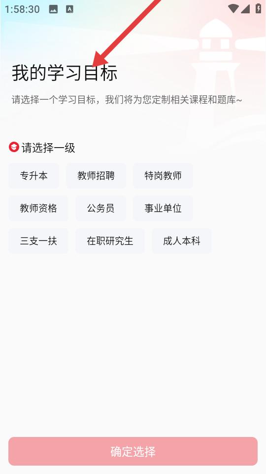 1、進入我的學習目標頁可從專升本教師招聘等多個學習方向中選擇一級目標,選定后點擊確定選擇,平臺將依據所選定制專屬課程和題庫。