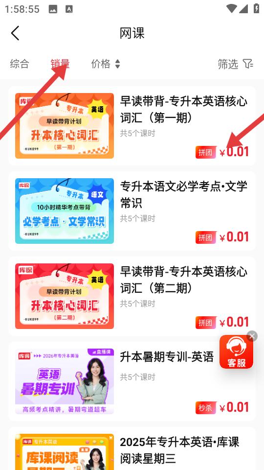 2、網課頁面通過綜合銷量價格等篩選項篩選課程,瀏覽專升本英語詞匯語文考點等多樣課程,查看課時數與拼團價格。