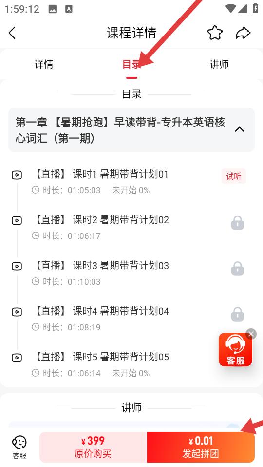 3、進入課程詳情頁切換至目錄欄查看課時安排,試聽免費課時體驗內容,對比原價與拼團價,可選擇原價購買或發起拼團。