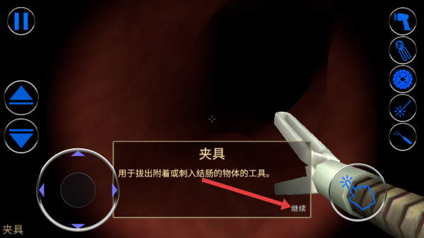 2、夾具可拔出附著或刺入結腸的物體,是重要的手術工具點擊繼續,就能使用夾具進行相關物體的拔出操作。