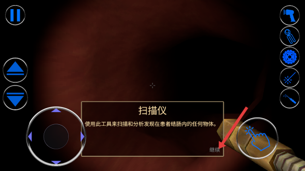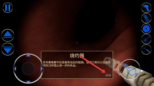 1、游戲有燒灼器,它能迅速關閉出血的腸道傷口,阻止進一步失血,使用時點擊繼續,開啟用燒灼器處理傷口的操作。