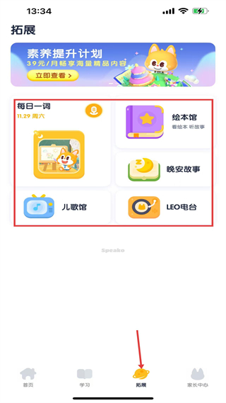 1、首頁,含39元月素養計劃,設每日一詞等模塊,提供繪本故事兒歌,輔助少兒素養與語言能力提升。