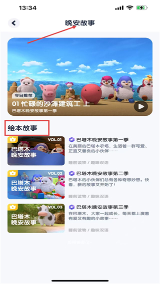 2、晚安故事頁,主推巴塔木晚安故事系列,以趣味雙語作睡前讀物,適配少兒睡前認知與語言啟蒙。