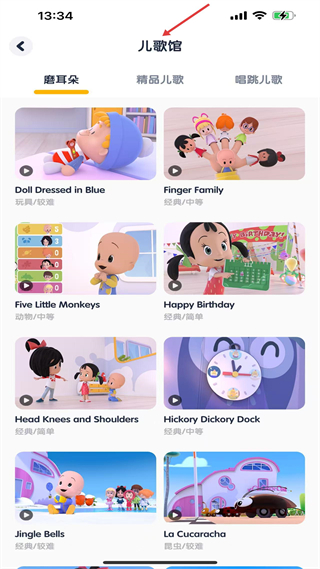 3、兒歌館頁,分磨耳朵等板塊,含Finger Family等兒歌,按難度主題分類,適配少兒語言磨耳與韻律感知。