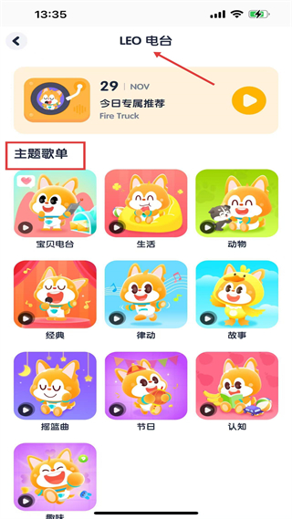 4、LEO電臺頁,設今日推薦與主題歌單,涵蓋多分類音頻,助力少兒在生活場景中完成認知與語言積累。