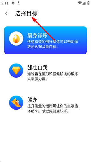 4、選擇目標界面,有瘦身鍛煉、強壯自我、健身三個目標可選,瘦身鍛煉可幫助輕松減重,強壯自我可增強力量,健身可提升能量循環。
