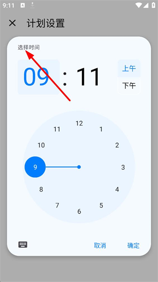 3、時間選擇界面,可設置鍛煉提醒時間,通過時鐘界面選擇小時和分鐘,還可選擇上午或下午,設置后點擊確定即可。