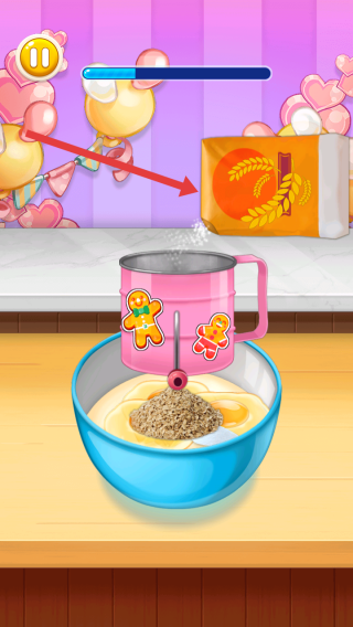 2、接著,通過粉色帶姜餅人圖案的器具,往碗里添加面粉等原料,讓食材進一步豐富,混合起來。