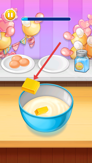 1、進入游戲烘焙環節,先往藍色的碗里添加黃油塊,碗里已有部分食材,添加黃油為后續制作做準備。