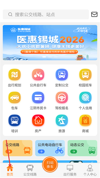 1、首頁,有出行規劃、公共自行車等功能入口,還有公交線路等服務選項,提供多樣出行及生活服務。