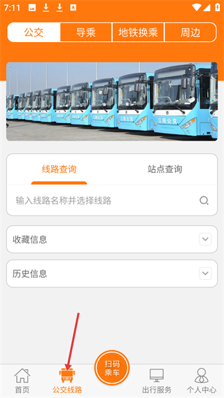 2、公交線路頁,可線路和站點查詢,還有收藏、歷史信息功能,方便查找公交信息。