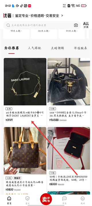 1、進入奢品易拍APP首頁,可查看為你推薦的奢品,如YSL手鏈、香奈兒包包等,選擇心儀的商品點擊進入詳情頁。