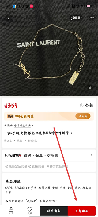 2、在商品詳情頁如YSL手鏈頁面,可查看商品價格、分期購信息和商品描述,點擊立即購買可進行交易,也可聯系賣家咨詢。