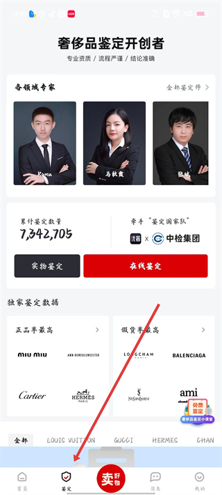 4、進入鑒定頁面可查看各領域鑒定專家,選擇在線鑒定或實物鑒定服務,還能了解獨家鑒定數據,如正品率最高的品牌等。