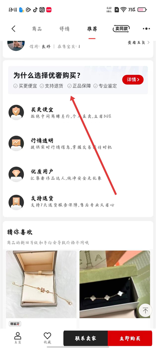 3、在推薦頁面可了解選擇該APP購買的優勢,如買更便宜、行情透明、支持退貨等,還能查看猜你喜歡的奢品。
