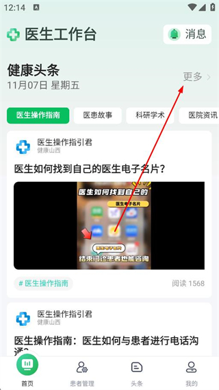 2、在健康頭條板塊點擊更多按鈕,可查看醫生操作指南、醫患故事等分類的文章,如醫生如何找到電子名片、醫生如何與患者電話溝通等內容。