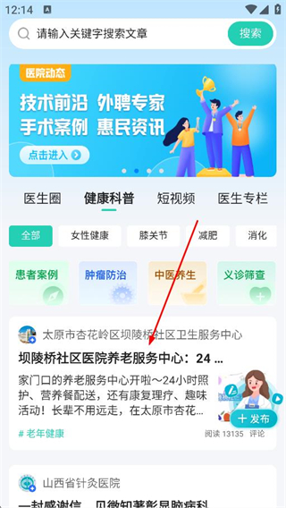3、進入健康科普板塊可查看不同分類的健康資訊,如女性健康、膝關節、減肥等,還有患者案例、腫瘤防治等內容,了解健康知識。
