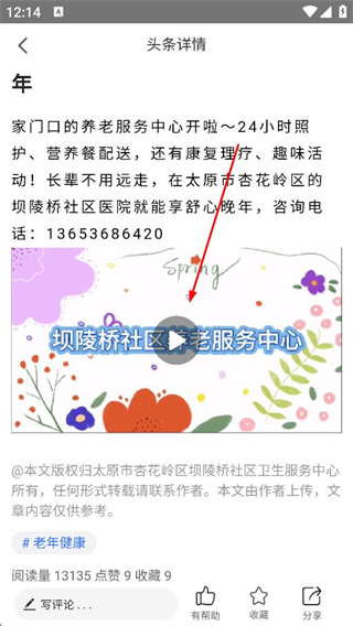 4、在頭條詳情頁可查看養老服務中心等健康資訊的詳細內容,包括服務介紹、咨詢電話等,還能進行點贊、收藏分享等。
