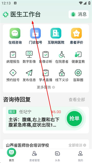 1、進入軟件后可在醫生工作臺查看在線咨詢、門診加號等功能,還能處理咨詢待回復的患者信息,如腹痛患者的圖文咨詢,點擊搶單進行回復。