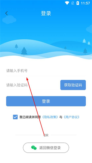 2、填寫手機號后點擊獲取驗證碼,將收到的驗證碼填入對應輸入框,勾選已閱讀并同意相關協議,點擊登錄按鈕完成賬號登錄。