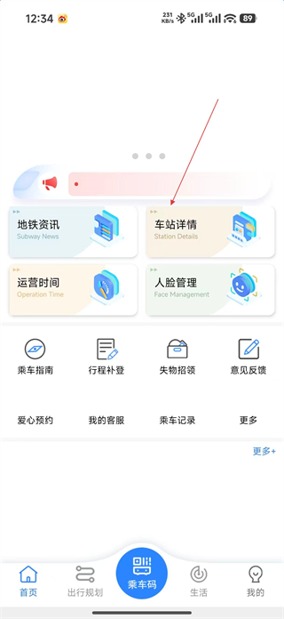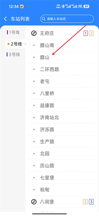 1、進入軟件首頁,找到車站詳情功能選項并點擊,進入車站列表頁面,可通過搜索框輸入車站名查找,也能選擇對應線路查看站點。