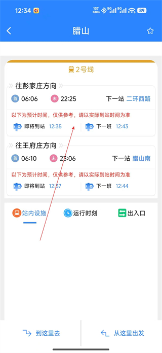 3、在站點詳情頁可查看站內設施運行時刻等信息,點擊到這里去選項,進入路線規劃頁面,準備設置起點進行行程規劃。
