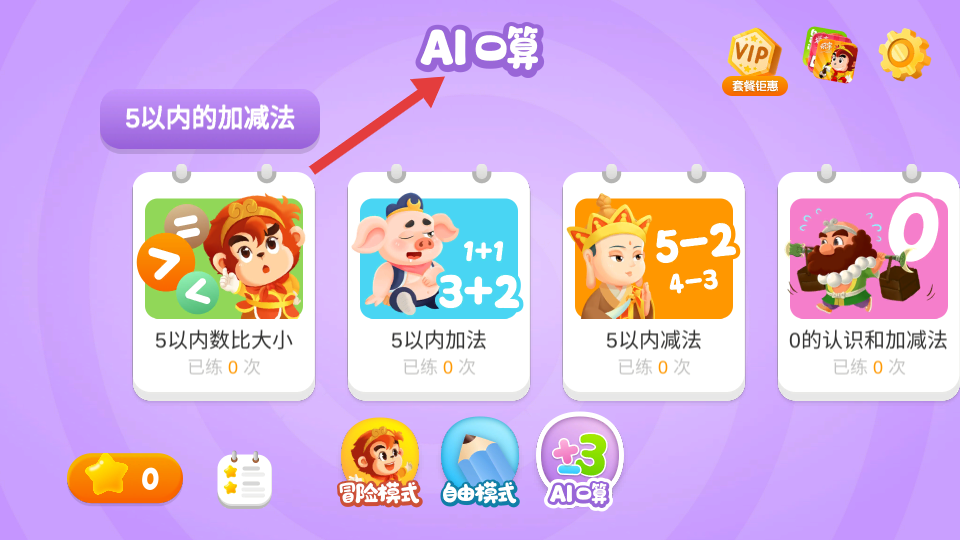 1、兒童數學學習APP界面突出AI口算功能,提供5以內數比大小等練習項目,已練次數均為0有冒險自由等多樣模式。