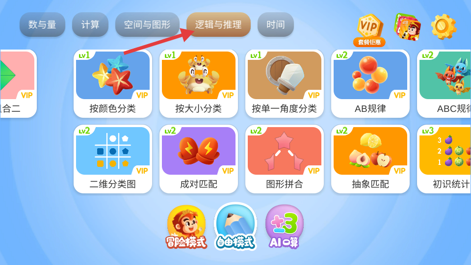 悟空數學是針對幼兒思維邏輯鍛煉而開發的產品。產品包含空間、時間、分類、規律、以及數和運算能力等幾大模塊的內容。設置24個學習單元,每個單元包含一個相關的啟蒙故事,通過故事建立孩子對學習概念的欲認知。然后進行思維訓練游戲,每個游戲精心設計有趣合理場景小故事,幫助孩子理解題目場景與題意,擺脫枯燥的單純做題目,提高解決問題能力。
