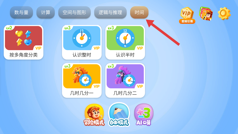4、時間學習界面可認識整時、半時、幾時幾分,通過生動圖示教學,幫孩子理解時間概念,大部分學習內容需VIP權限。