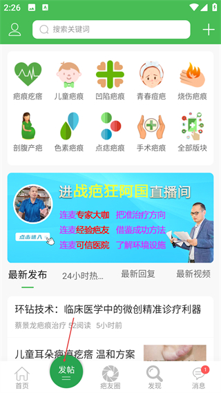1、進入首頁后,可選擇疤痕疙瘩兒童疤痕等不同疤痕類型分類查看,點擊進入直播間連麥專家疤友或醫院,也能點擊發帖按鈕分享自身相關內容。