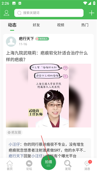 2、切換到論壇界面,可瀏覽動態板塊里的疤痕相關內容,包括知識達人發布的科普信息,還能點擊拍攝按鈕創作并分享疤痕相關的內容。
