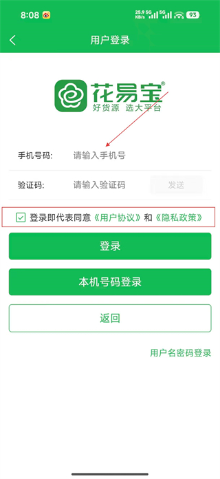 1、進入花易寶用戶登錄頁,在手機號欄輸入本人號碼,點擊發送獲取驗證碼,填入驗證碼后勾選同意協議,選擇登錄或本機號碼登錄按鈕完成賬號登錄。