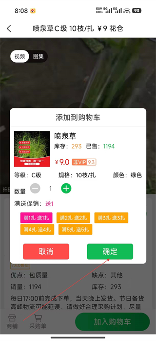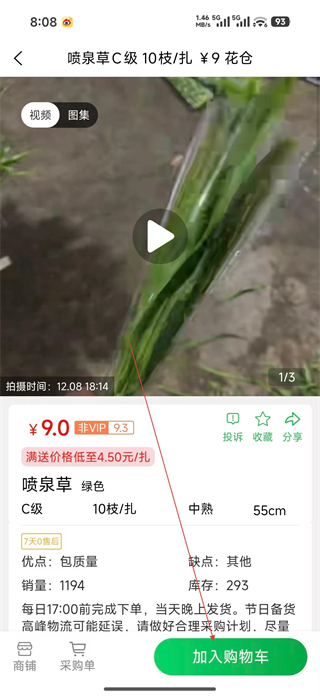 3、在噴泉草詳情頁查看商品的視頻圖集及參數信息,確認規格等級等符合需求后,點擊頁面底部的加入購物車按鈕,進入購物車添加界面。