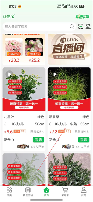 2、登錄后進入首頁瀏覽展示的花卉商品,查看各商品的價格規格等信息,找到意向商品如噴泉草,點擊該商品條目,進入其詳情頁面了解更多內容。