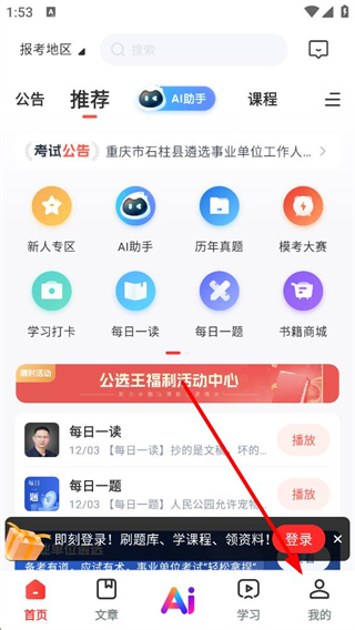 1、進入應用首頁可查看考試公告,使用新人專區助手等功能,參與學習打卡每日一題等板塊,借助這些資源開展公務員遴選備考。