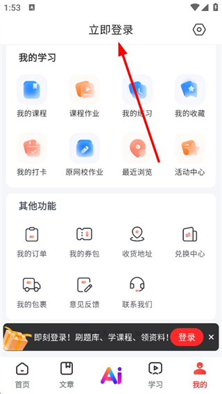 2、點擊我的選項進入個人中心,可管理我的課程練習收藏等學習內容,使用我的訂單券包等功能,統籌個人備考相關的資產與服務。