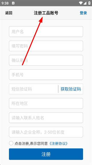 4、注冊賬號時需填寫用戶名密碼手機號等信息,獲取并填寫短信驗證碼,補充地區聯系人企業名稱等內容,勾選注冊協議后點擊注冊完成賬號創建。