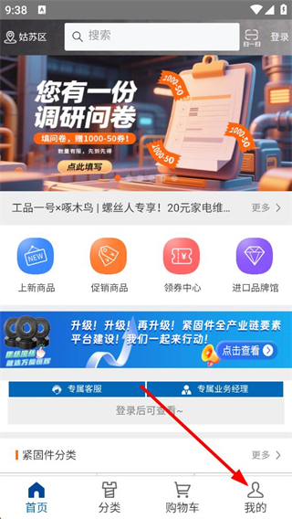 1、進入首頁可參與調研問卷領券,也能通過上新商品促銷商品等入口瀏覽商品,還可切換至分類購物車我的等功能區,使用專屬客服等服務。