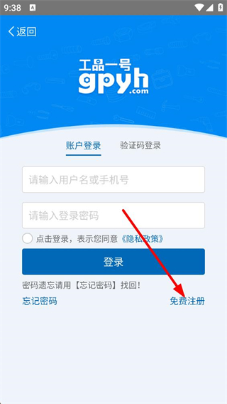 3、登錄界面可選擇賬戶登錄或驗證碼登錄,賬戶登錄需輸入用戶名或手機號及密碼,勾選隱私政策后點擊登錄,也可選擇免費注冊創建賬號。