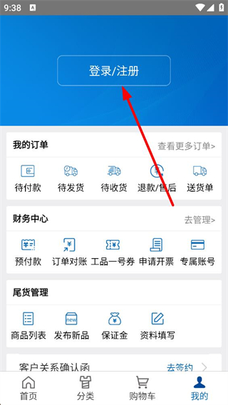 2、進入我的頁面可管理訂單,包含待付款待發貨等狀態,也能操作財務中心尾貨管理等功能,點擊登錄、注冊按鈕可進入賬號登錄或注冊流程。