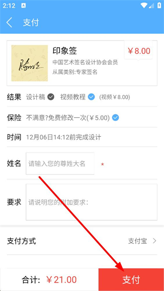 4、進入支付界面,確認印象簽的設計內容與費用等信息,填寫姓名及要求后,選支付方式點擊支付完成設計下單。