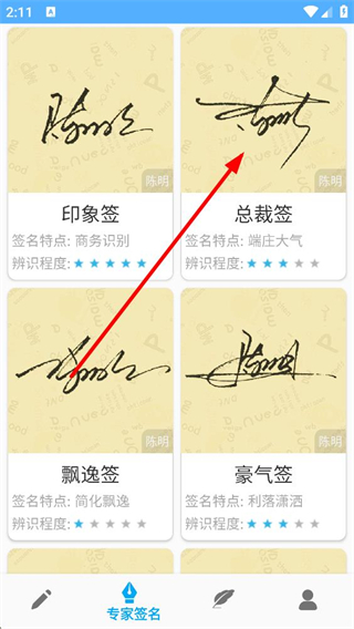 2、切換到專家簽名界面,能看到印象簽總裁簽等多種簽名類型,每種都有對應的特點與辨識程度說明供挑選。